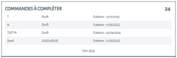 Option 1 : depuis le tableau de bord, repérer l'encart "commandes à compléter". Cliquez sur la commande recherchée ou sur “Voir plus” pour afficher la liste complète.